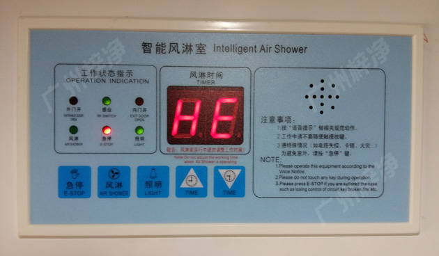 第三步:風(fēng)淋室控制器面板風(fēng)淋時(shí)間顯示區(qū)會出現(xiàn)”HE”字符,松開急停(看下圖);