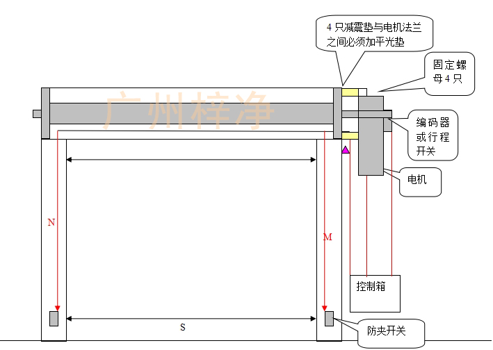 2、裝卷軸:(要求鏍絲墊片按說明裝,聯(lián)接牢固)裝卷軸抬起分別與M、N門框相連接;