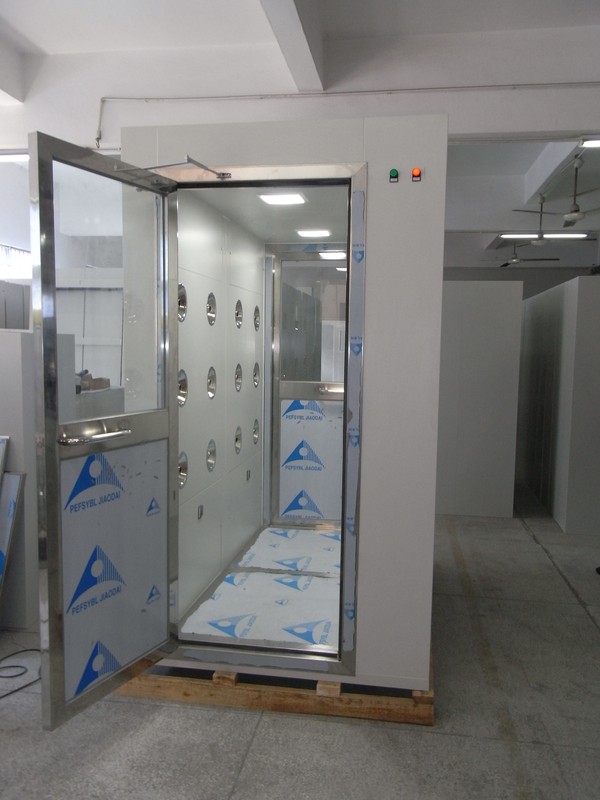 風(fēng)淋門工作原理:風(fēng)淋門經(jīng)高效過濾器過濾后的潔凈氣流由可旋轉(zhuǎn)噴嘴從各個方向噴射至人身上,從而有效而迅速地清除塵埃粒子。清除后的塵埃粒子再經(jīng)由初 、高效過濾器過濾后重新循環(huán)到風(fēng)淋區(qū)域內(nèi)。為了達(dá)到吹淋的最佳效果,風(fēng)淋門設(shè)計的噴嘴出風(fēng)口風(fēng)速能達(dá)到25m/s以上,吹到人身上的風(fēng)速最低18m/s,出廠的初始風(fēng)淋時間設(shè)置為15秒風(fēng)淋門提供了模塊化的組裝方式,可以按實際需要拼裝成各種長度的風(fēng)淋尺寸。