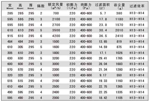 組合式高效過濾器規(guī)格尺寸及技術(shù)參數(shù):