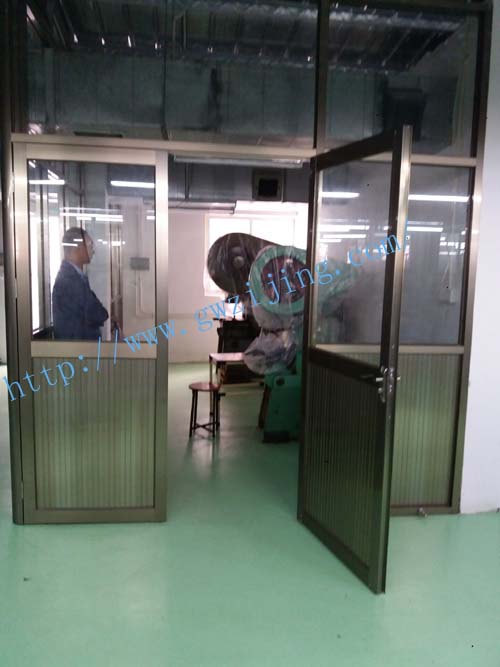 無塵室內(nèi)的風(fēng)淋門風(fēng)淋室門是電子聯(lián)鎖,當(dāng)一扇門打開隱形眼鏡時(shí)另一扇門自動(dòng)鎖定,風(fēng)淋室切勿同時(shí)強(qiáng)迫開關(guān)兩扇門,風(fēng)淋室系統(tǒng)運(yùn)行時(shí)切勿強(qiáng)迫開關(guān)任何一扇門。