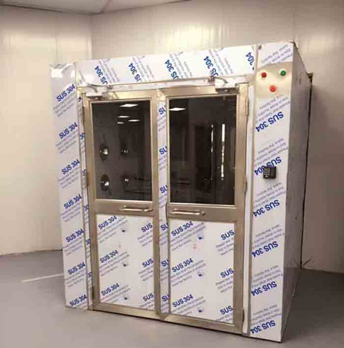 1、雙吹風(fēng)淋室,采用冷軋鋼板或不銹鋼制作而成;