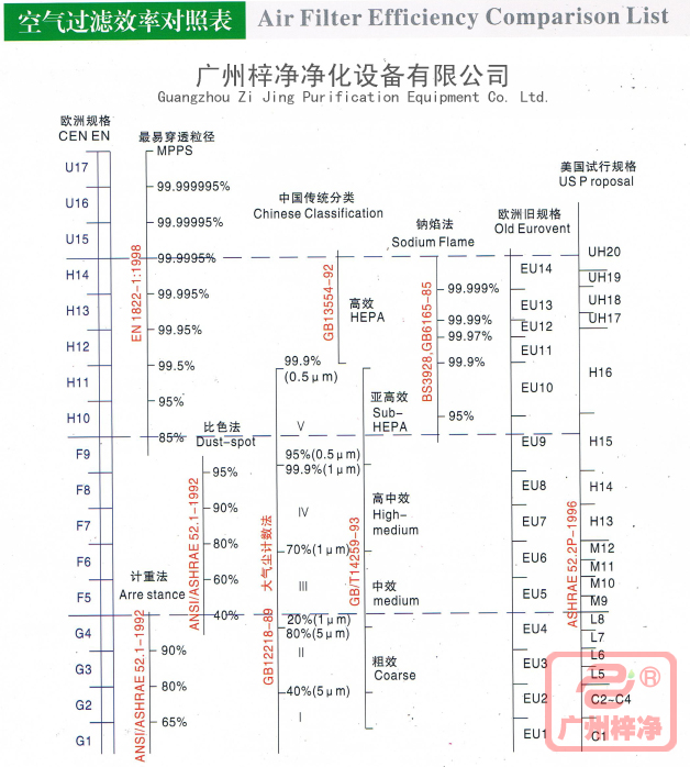 當(dāng)前位置:首頁 >> 風(fēng)淋室故障|風(fēng)淋室維修技術(shù) >> 空氣過濾器效率對照表空氣過濾器效率對照表分為歐洲規(guī)格、中國傳統(tǒng)分類、歐洲舊規(guī)格、美國試行規(guī)格。