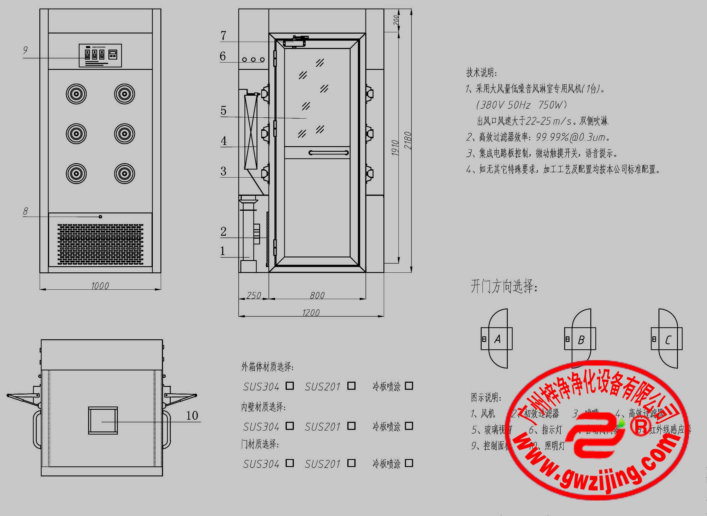 “梓凈”牌1200型單人雙吹風淋室配置: