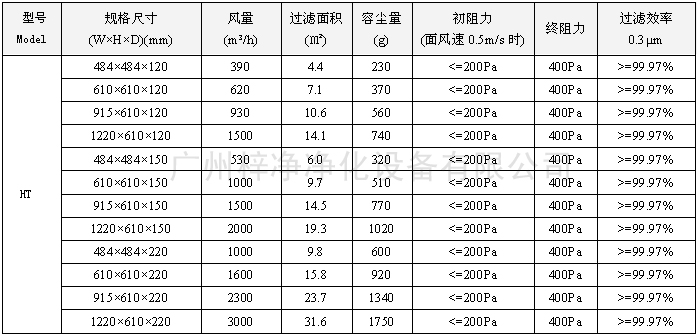 400度耐高溫高效過濾器型號尺寸及其它技術(shù)參數(shù):