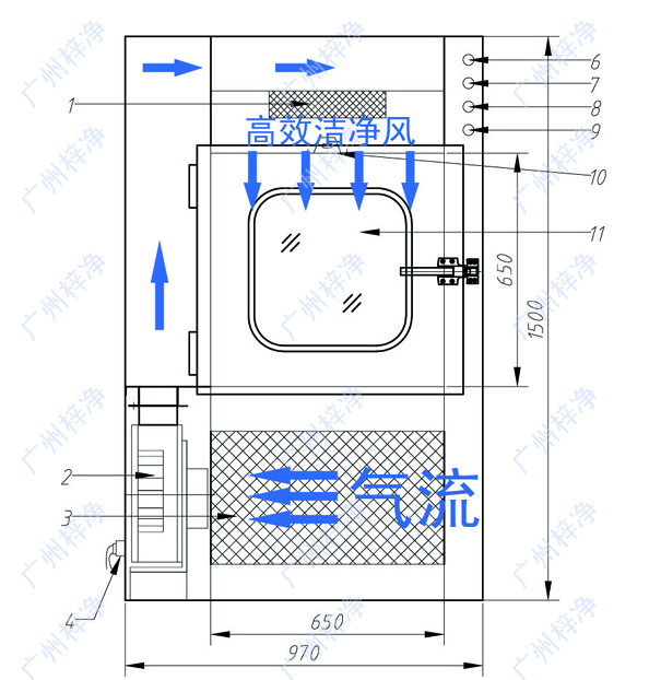 注:普通傳遞窗工作原理,只是保證傳遞窗雙門或三門聯(lián)鎖/互鎖,沒有風(fēng)淋等高效過濾器裝置。
